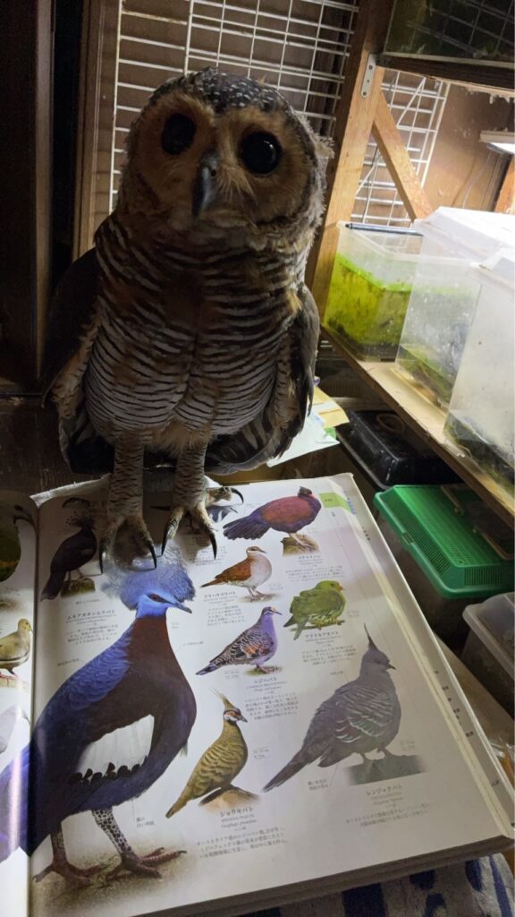 因みにこれは部屋ハック?しているマレーモリフクロウさんです。図鑑を見ていたら、突然飛来しました。一緒に図鑑を見ています。が。なんとなく絵面を食おうとしていました。餌はあげたのですがね。