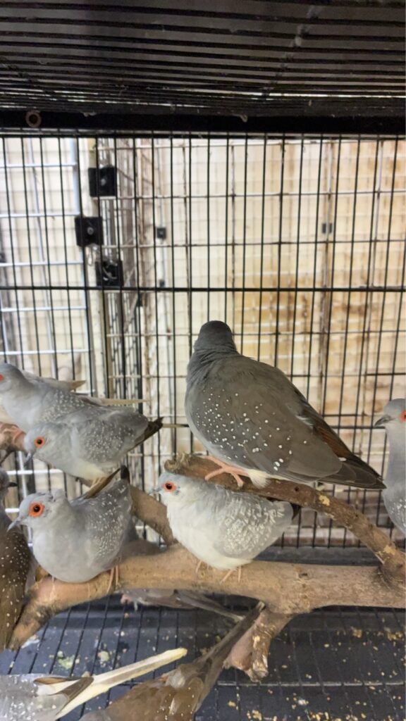 ミックスシードやフィンチ用配合飼料、マズリー社製スモールバードブリーダーなどを与えています。広い飼育舎でのびのびと育っているため、とてもよく飛びますし、逃げ出したら恐ろしい事態になりそうです。人慣れはそこそこしています。今なら選び放題です。雌雄問わず、何羽か抜け羽がありますが、後尾を迫られた時に抜けてしまったようです。みんな餌をよく食べて元気です。