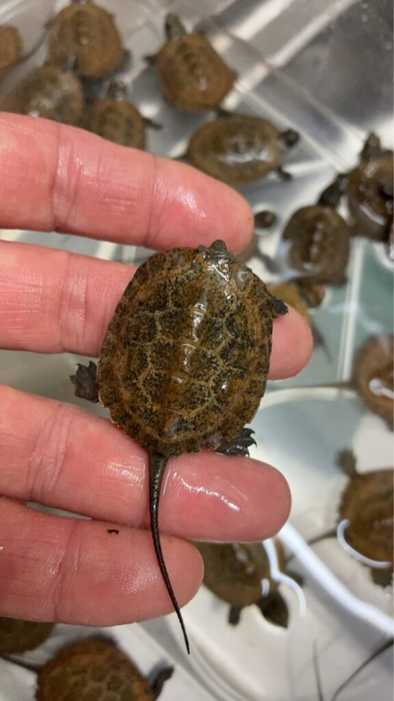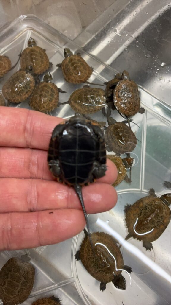 2025年7〜8月生まれの幼亀達です。餌は主にはサキヒカリなどを与えていますが、時折、乾燥エビやウズラミンチなども少し与えています。配合餌や乾燥エビは水場で与えますが、肉類などは口に入るサイズにしたものを落馬で与えております。水換えは汚れるたびに交換し、日光浴も欠かしません。温度は20〜28度で管理していますが、基本スポットライトなどは使わずに、日光浴の甲羅干しをさせています。イシガメ病予防を兼ねてOTC薬浴はさせていますが、長時間させる飼育者さんもいるようですが、