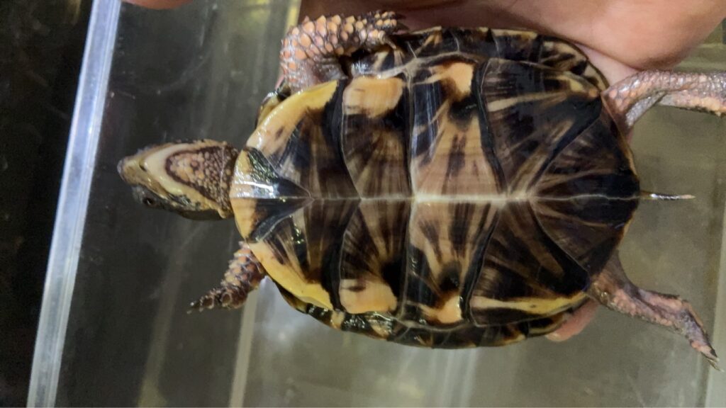 アメリカハコガメの中の最もよく目にする機会の多いミツユビハコガメと並ぶカロリナハコガメの代表的なトウブハコガメの中の色彩に特徴的な個体のご紹介です。カロリナハコガメの原名亜種として、近年特に人気の高いトウブハコガメは、多様な色彩的特徴を発現する人気のペットカメです。今回の個体はより黒の発色と面積の広いのが特徴的な個体です。色彩変異なのか、選別交配の結果なのかは不明です。頭部全体的に黒色で、オレンジの発色は少なく、甲羅全体も同じように黒い個体です。元気は良く、サキヒカリをばくばく食べております。こまめな日光浴をさせておりますが、より黒くなるのか?どうなんですかね?よく目にするのはブラックガルフコーストハコガメはよく目にしますが、黒色発言の強いトウブハコガメって珍しいのですかね?今回は一頭のみの入荷、180.000円です。