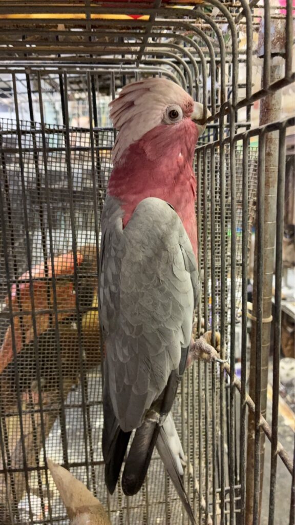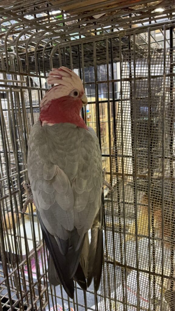 ピンク色が腹部から顔、首周りに広がる中型インコのモモイロインコ。クルマサカオウムには負けますが、とても綺麗なインコです。年齢不詳ですが、八歳以上でやや神経質な個体となりますが、普段は遊んできたり、イタズラしたりしてきて可愛らしいところもありますが、やはり白色系オウムに近いことから、イタズラ大好きでかじり木を入れると恐ろしいほどの根気で粉々にしてくれます。木を細かくして捨てたい時には非常に役に立つ能力ですが、基本的に、止まり木やあらゆるものを壊すことにもなります。恐ろしいですね!そんなモモイロインコは最近、数も少なく、評価が上がっています。左足の第二指の爪が欠落していますが、とても健康的に育っております。思い入れのある個体で、展示などにも使っていました。