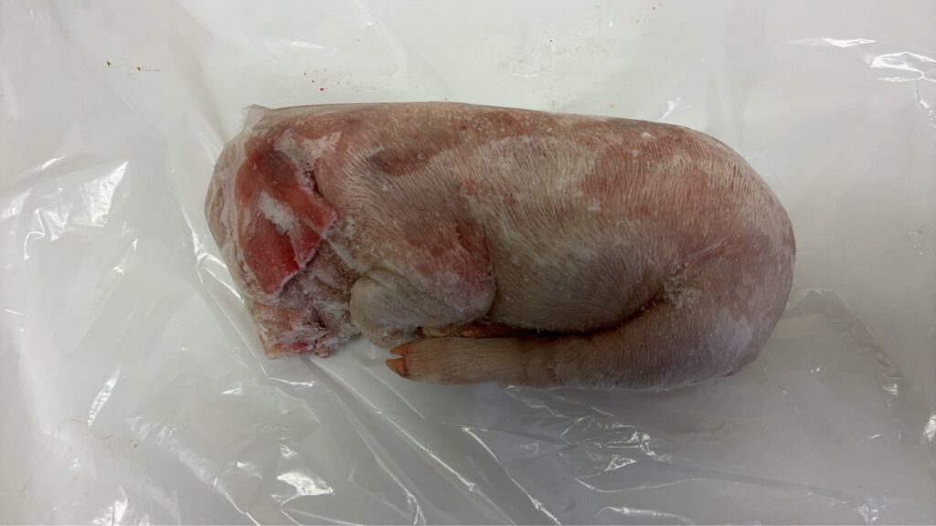 以前から子豚を販売していましたが、主にボアコンさんとモルルスさんの餌として与えていました。が、餌として販売していることを今一度ご紹介しようと思います。ウズラやヒヨコ、マウスやピンクマウス、鶏肺や鶏頭などを販売していますが、あまり需要のない子豚ですが、新鮮な産児直後の個体で、間引いたりしたものを有効活用したものとなります。重さやサイズなどでバラバラですが、800〜900グラムから、1800〜2000グラム程度のものが有ります。重さによってまちまちですが、一頭1.200円〜程度の販売で、大きなものは1.800〜2.000円程度となります。毎回測って販売していますので、現在飼育中の子豚を餌とする生体に合わせて選ぶことも可能です。大体、サイズにもよりますが、成体のボアコンで800〜1.000グラムのコブタを20〜30分で飲み終えますが、ボアコンの方がモルルスよりもコブタを飲むのは上手な気も致します。常に在庫ありますので、ご入用の方はお電話にてお願いいたします。