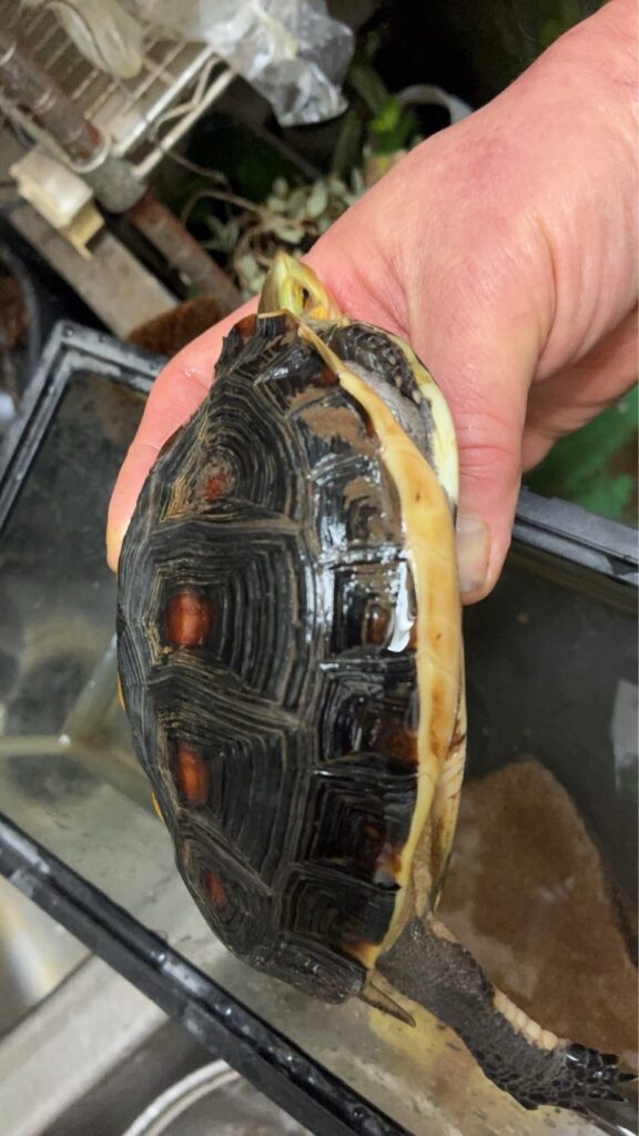 昔からお馴染みのセマルハコガメのご紹介です。今回は飼育下繁殖個体の育て上げた個体となります。体色も綺麗ですが、やや甲羅にソブがついてたりしますが、そこはご愛嬌でお願いします。じっくりと育て上げた雌雄となります。もちろん血統違いの個体となります。オスは飼育下では数が少ないのですが、何故か南西諸島や原産地域外外来個体では非常にオスが多くなっていることも知られています。市場に出回らない為、飼育下繁殖個体のオスは希少です。オスの方がやや大きく、個体の赤みも強くなっていますが、俗に言われるアカセマルの血統ではありません。餌はサキヒカリを中心に配合飼料や、ピンクマウス、ウズラミンチなどを主に与えています。モリモリよく食べていますが、冬場は20〜25度で飼育していますので、ウインタークーリングはしていません。寒い飼育時期がある程度となります。浅水張り飼育が主体で、為に甲羅にソブが付着していますが、それ以外は比較的優良個体の認識となります。オスは2019年生まれ、メスは2020年生まれとなります。国内の優良ブリーダーからの幼亀をじっくり育て上げました。最速での飼育ではありませんが、人慣れもして安心してご提供できる個体となります。