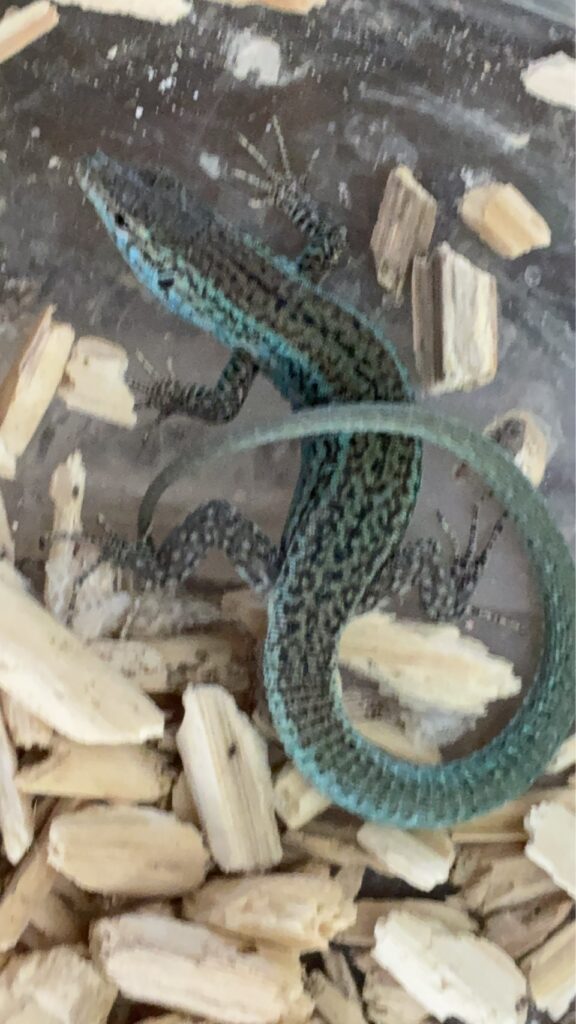 小型のカナヘビですが、成体ではとても綺麗な青系の体色を発します。朝日に当たる日光浴時には目の覚める青系体色で、あまり流通していない珍種です。エサはヨーロッパイエコオロギのエスサイズやミルワーム、あと、少し配合餌も食べますが、主に栄養剤をまぶしたサイズを合わせた昆虫を与えています。勢いよく餌昆虫を食べ、珍種の割には手間がかかりません。小型でコレクション性もあり、隠れ家から出て来なかったりしますが、慣れてくるとよく姿を表すようになります。そもそも好隠性の様子で体が温まると素早く動き、上下の行動量も激しくなるので、しっかりとしたフタができる飼育容器使い、脱走には特に注意し、近縁種を飼育する時にはケージ間での管理は十分に注意しています。ペア320.000円、雌雄それぞれは一頭180.000でのご提供となります。