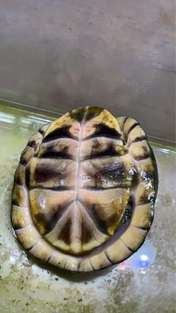 密輸日は子亀ではなく、ミツユビハコガメのご紹介です。黒の基本の体色にメニースポットの体色がすでに発現しているセレクト個体となります。比較的安価な種類ですが、この個体のような体色を発現する個体は稀。成体では黒に黄色の柄が入り、別の種類のカメに見えるほどです。こちらのブリーダーさんは屋外繁殖、屋外孵化が基本なため、雌雄は分かりません。TSDも不明となります。毎日、サキヒカリを食べていますが、ピンクマウスや昆虫はそこまで与えていませんが、目の色を変えて追いかけて食べたりします。縁甲板より上に水位が来る程度の水深で飼育しています。ひっくり返りには要注意となりますが、よく慣れて、人の姿を見ると首を伸ばして餌をねだります。ですが、何か異常があればすぐに首を引っ込めで防御するように少し脅かせたりもした方が、事故が少なくすみます。